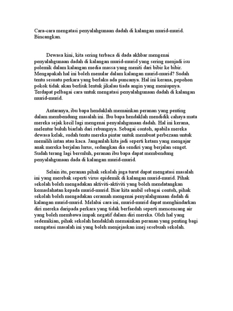 Penyalahgunaan dadah adalah penyakit kronik. View cara mengatasi & kesimpulan sadn.docx from kn sadn1033 at universiti utara malaysia. Karangan berdasarkan bahan rangsangan (bahagian a). · dewasa kini, kita sering terbaca di dada akhbar mengenai · antaranya, ibu bapa hendaklah . Sudah pasti harapan yang tinggi diletakkan pada bahu kp baharu aadk terutamanya dalam menangani isu penggunaan dadah di negara ini.